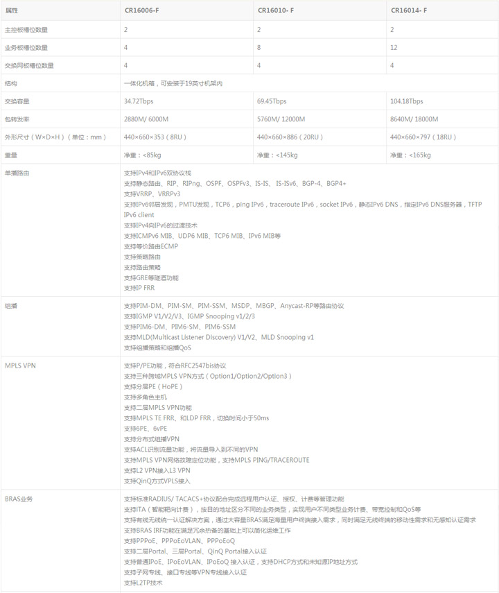 CR16000-F是H3C自主研發(fā)的高端路由器,采用先進的硬件架構,支持高密度10GE、40GE、100GE接口,單槽位性能靈活擴展,可滿足不同網(wǎng)絡位置需求;支持先進的網(wǎng)絡操作系統(tǒng)Comware V7,該操作系統(tǒng)在多核CPU的支持、分布式計算、模塊化的設計、高可用性架構、虛擬化、開放性等方面與CR16000-F完美融合;采用創(chuàng)新的虛擬化技術IRF2.0,可在提高網(wǎng)絡可靠性的同時降低設備維護工作量;支持強大的BRAS功能,可滿足運營商多業(yè)務邊緣MSE設備以及高校園區(qū)網(wǎng)核心設備的發(fā)展需求;支持多種網(wǎng)絡保護技術和1588v2同步以太網(wǎng)等功能,可以作為ER路由器滿足運營商IPRAN組網(wǎng)需求。