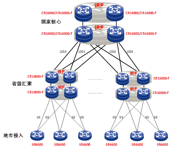 國家級廣域網(wǎng)由于地域上覆蓋的廣闊性,對網(wǎng)絡設備的可靠性和安全性要求很高,CR16000-F可以作為國家核心和省級匯聚節(jié)點。為了保證網(wǎng)絡的安全性,在國家核心、省級節(jié)點采用上下行設備分開的設計架構;省級和地市節(jié)點同時作為城域網(wǎng)匯聚接入、專線匯聚、窄帶接入。
