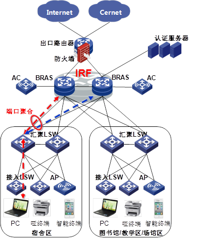H3C BRAS支持iTA(智能靶向計費),通過訪問的目的地址來區(qū)分不同的業(yè)務(wù)流量,提供不同的帶寬、計費、Qos策略等,滿足高校用戶對訪問校內(nèi)網(wǎng)、Cernet、Internet等不同速率不同計費策略要求;提供有線無線統(tǒng)一認證解決方案,通過大容量BRAS滿足海量用戶終端接入需求,滿足無線終端的移動性需求;BRAS IRF功能在滿足冗余熱備的基礎(chǔ)上可以簡化運維工作。