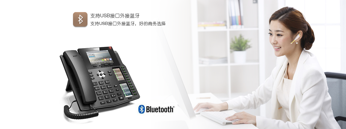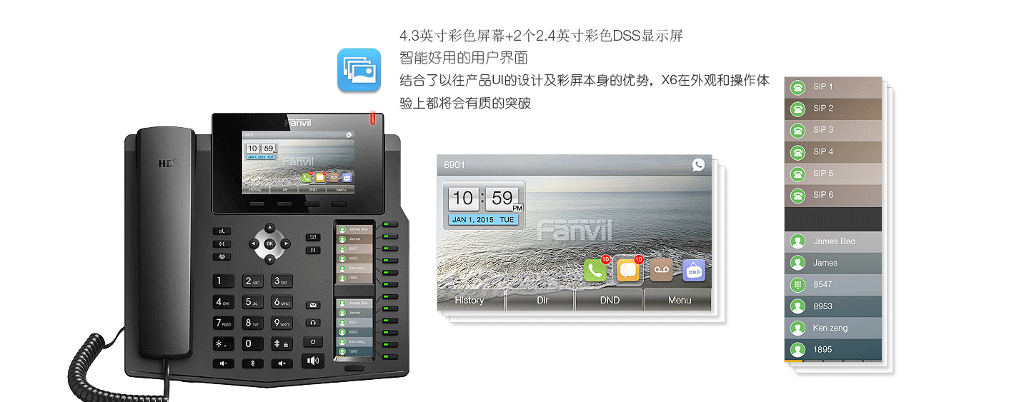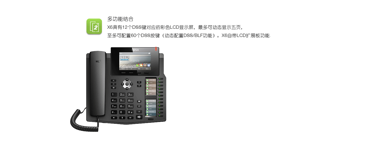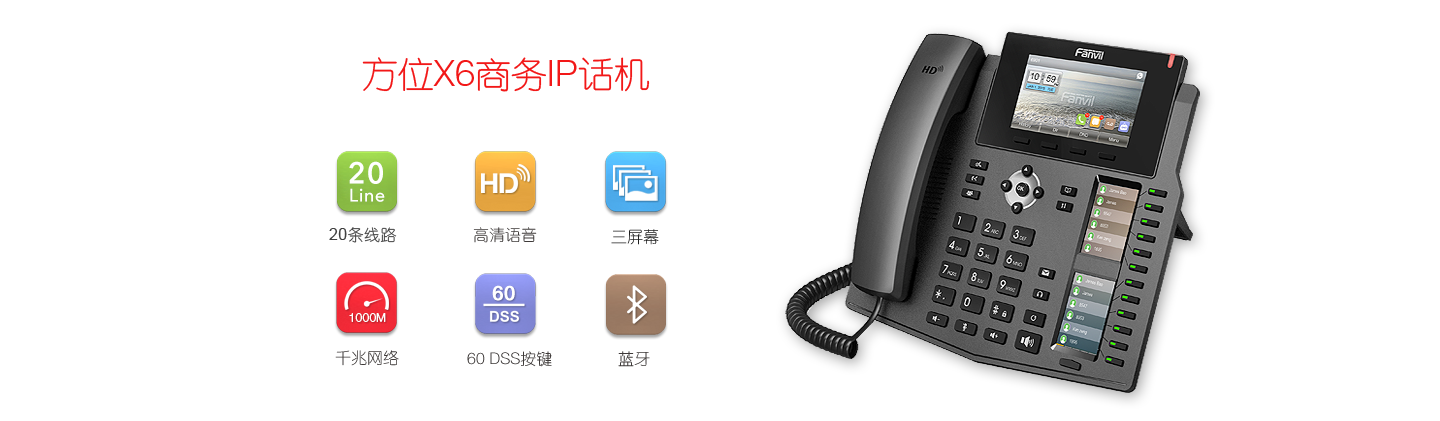 X6商務(wù)話機采用4.3英寸彩色大顯示屏,擁有2個對應(yīng)DSS按鍵的副屏,高清語音。并且可以解碼視頻流,實現(xiàn)和網(wǎng)絡(luò)攝像頭和可視門禁的視頻聯(lián)動。X6支持千兆網(wǎng),USB接口可外接藍牙,功能豐富。DSS按鍵最多可配置60個,大大的提高工作效率。