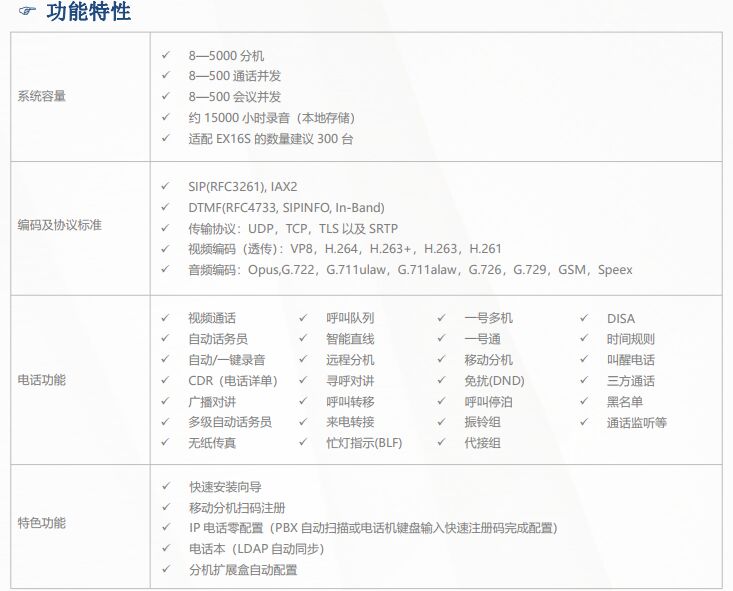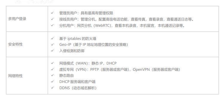 ? 功能亮點(diǎn) 快速安裝向?qū)? 快速安裝向?qū)Ш啙嵰子霉δ軓?qiáng)大,能快速引導(dǎo)用戶完成新系統(tǒng) 安裝部署的必備基礎(chǔ)設(shè)置,無需用戶具備專業(yè)知識(shí)。 話機(jī)終端零配置 IP 話機(jī)自動(dòng)掃描,一鍵分配分機(jī)號(hào);中聯(lián)話機(jī)還可通過快速注 冊碼快速精確從話機(jī)端完成注冊;CooCall 軟電話掃描二維碼 即可完成注冊。 分機(jī)擴(kuò)展盒零配置 分機(jī)擴(kuò)展盒能幫助用戶在較短的時(shí)間內(nèi)大規(guī)模部署大量的模 擬話機(jī)終端。新舊設(shè)備的替換也能達(dá)到一鍵切換。 郵件提醒功能 提供常用的郵件服務(wù)商設(shè)置模板,支持郵件發(fā)送分機(jī)二維碼, 郵件提醒新留言,郵件提醒新傳真,郵件通知系統(tǒng)事件等。 一號(hào)多機(jī) 一個(gè)分機(jī)號(hào)碼最多可以同時(shí)在 5 個(gè)終端上注冊使用,座機(jī)和手 機(jī)(CooCall 軟話機(jī))可以共享一個(gè)分機(jī)號(hào),隨時(shí)隨地不漏掉 任何重要電話。 分機(jī)用戶界面 分機(jī)用戶只需要有瀏覽器,并且無需安裝任何插件即可使用分機(jī) 接打電話。語音留言,電話錄音可直接在線播放收聽。傳真亦可 在線發(fā)送。